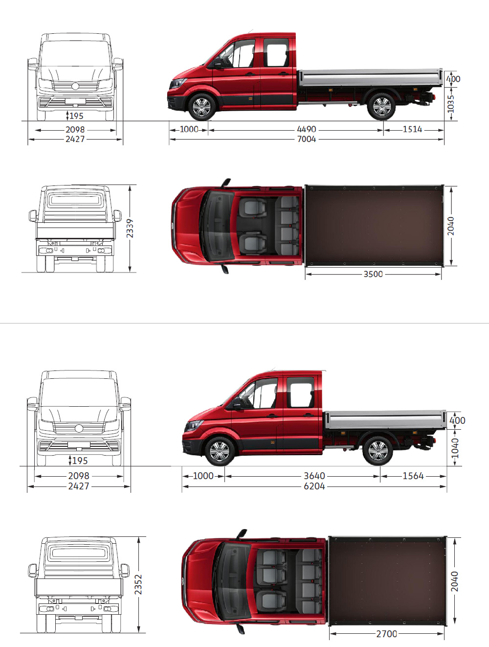 | אורך (מ"מ) | קראפטר 5 טון דאבל קבינה בינוני אוטומט6,204 | קראפטר 5 טון דאבל קבינה ארוך אוטומט7,004 |
