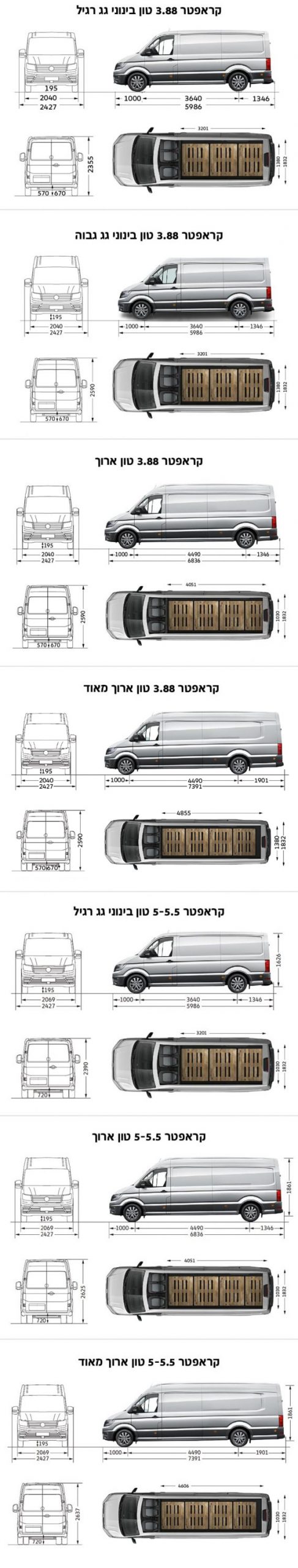 הקראפטר מאפשר בחירה מבין מגוון רחב של מידות ומשקלות, כך שתוכלו להתאים אותו באופן מדוייק לצורכי העסק שלכם. תוכלו לבחור קראפטר במשקל כולל של 3.5, 5.0 או 5.5 טון, בבסיס גלגלים בינוני (3.640 מטרים) או ארוך (4.490 מטרים), ובאורך מרכב בינוני (5.986 מטרים), ארוך (6.839 מטרים) או ארוך מאוד (7.391 מטרים). מבחר של חמישה גבהי גג, בין 2.637-2.355 מטרים, מאפשר לכם להתאים את נפח ההעמסה שנע בין 16,400-9,300 ליטרים.